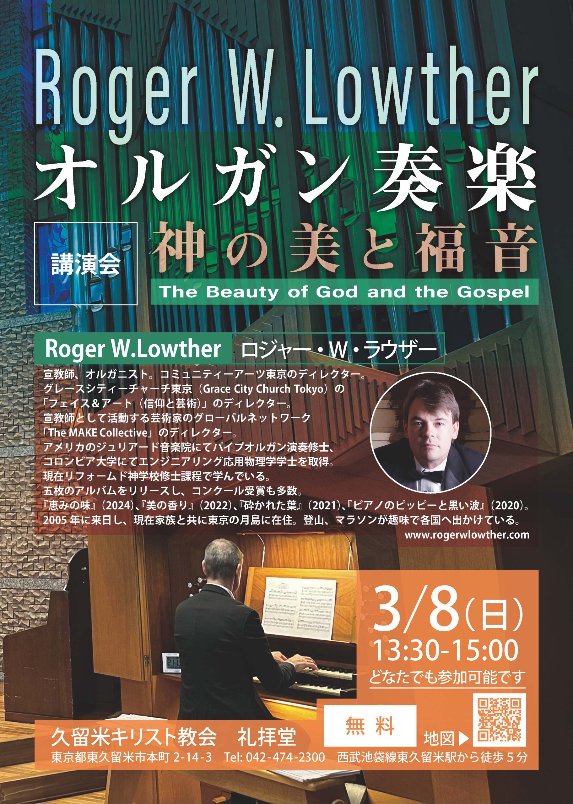 top1Kurume Christ Churchtop2KCCsky初めにことばがあった。 ことばは神とともにあった。 ことばは神であった。 ヨハネの福音書1:1 kcc3 \ ようこそ / 久留米キリスト教会へ はじめての皆さんへ わたしたちは東京都東久留米市にある単立のプロテスタント教会です。こちらでは日曜日の礼拝動画と週報を掲載しております。ぜひご覧ください。 礼拝&週報アーカイブへ 教会員の皆さんへ 日曜11時からの第二礼拝をオンラインでライブ配信しています。時間になりましたら、こちらからご視聴ください。(教会員限定のページとなります) YouTubeライブ礼拝へ 教会紹介教会概要牧師紹介施設 礼拝について礼拝時間メッセージ 教会活動キッズチャペル中高生会・青年会ルデヤ会・ゆりの会祈祷会 喫茶グレイス営業時間毎週月曜日10:00~12:00礼拝堂1Fマルチルーム KCC最新NEWS イベント ロジャー・W・ラウザー氏 オルガンコンサート • 2026.03.5 • イベント 喫茶グレイス 喫茶グレイス • 2026.02.12 • 喫茶グレイス アクセス 久留米キリスト教会 〒203-0053 東京都東久留米市本町2-14-3TEL : 042-474-2300 西武線路線図 東久留米駅詳細 西武池袋線「東久留米駅」より徒歩7分